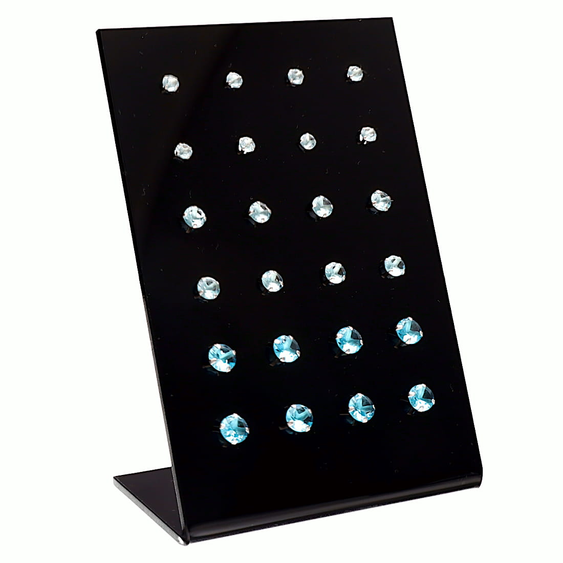 Elegancki zestaw 12 par srebrnych kolczyków sztyftów (wkrętek), wykonanych ze srebra próby 925 i pokrytych trwałą warstwą rodu. Każdy kolczyk zdobi lśniąca, okrągła cyrkonia w kolorze błekitnym, o średnicy 3, 4 lub 5 mm, zapewniająca subtelny i elegancki wygląd. Na każdym displayu jest po 4 pary kolczyków z cyrkonią 3, 4 i 5 mm kolorze różowym.