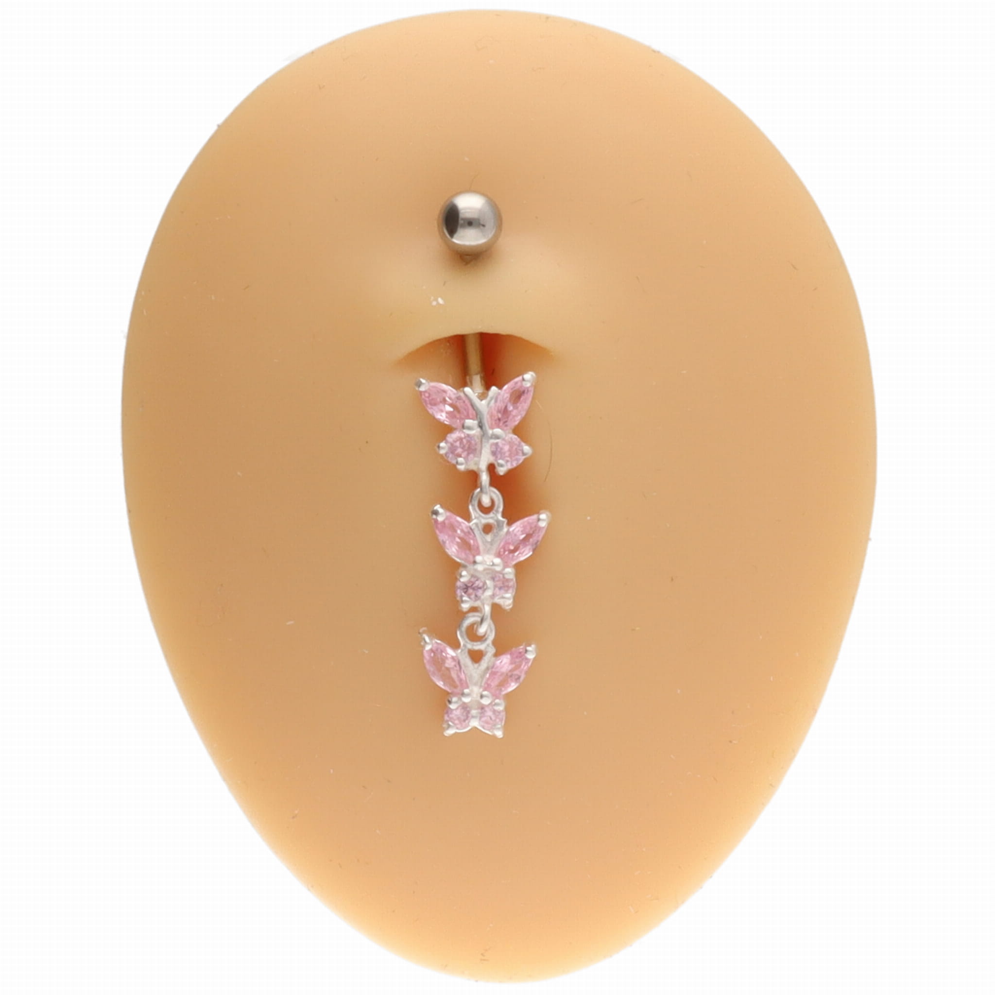 Kolczyk z wiszącym srebrnym (Ag 925) dekorem składającym się z trzech małych motylków. Wszystkie kamienie są w kolorze różowym.
