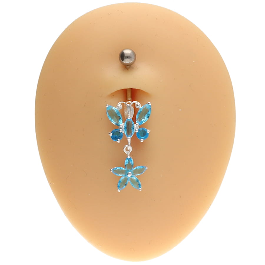 Kolczyk z wiszącym srebrnym (Ag 925) 2-elementowym dekorem składającym się z motylka i zawieszonego poniżej kwiatuszka. Wszystkie cyrkonie są w kolorze błękitnym.