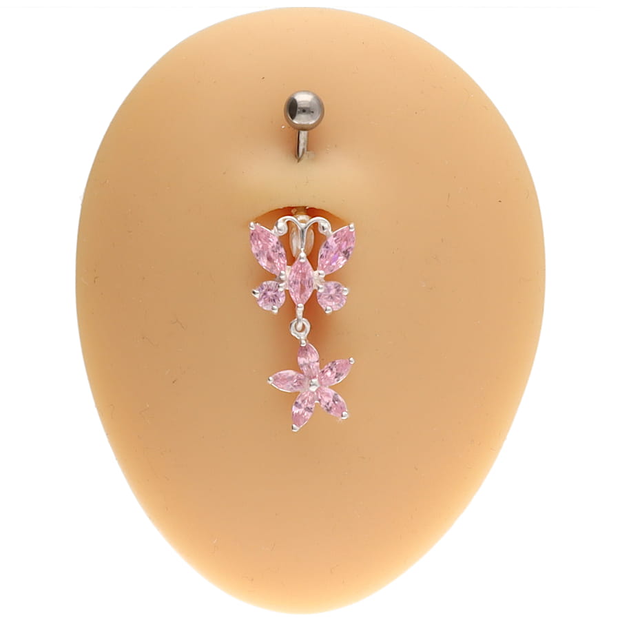 Kolczyk z wiszącym srebrnym (Ag 925) 2-elementowym dekorem składającym się z motylka i zawieszonego poniżej kwiatuszka. Wszystkie cyrkonie są w kolorze różowym.
