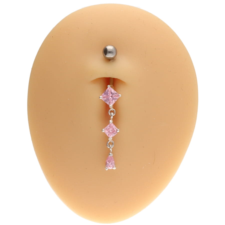 Dekoracyjny wygięty kolczyk do pępka, banan ze stali chirurgicznej w naturalnym srebrnym kolorze. Do banana dowieszona jest ozdoba ze Srebra próby 925 i zakuwanych cyrkonii. Ozdoba składa się z trzech elementów. Pierwszy jest zlutowany sztywno ze sztangą, pozostałe, połączone za pomocą ogniw, są ruchome.