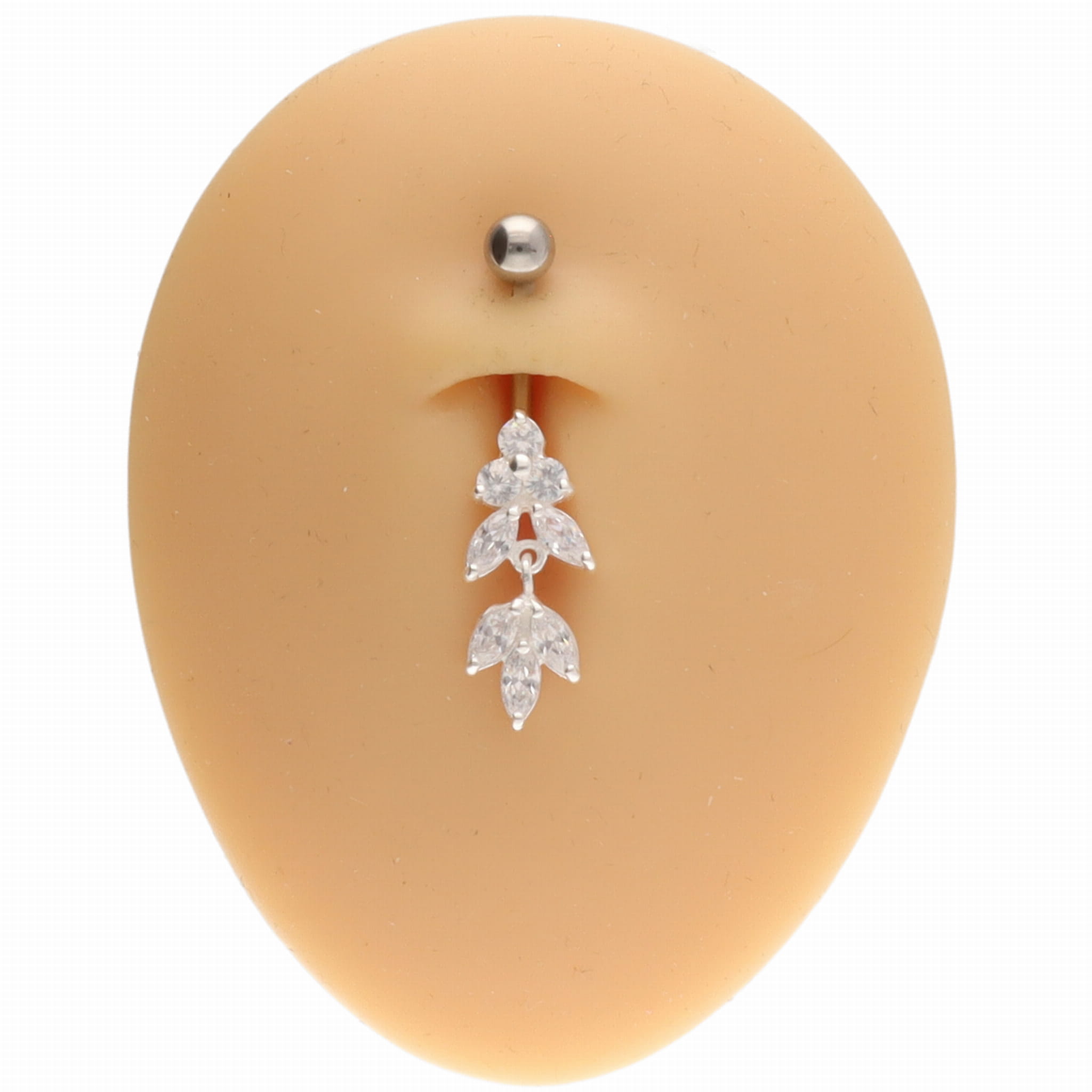 Kolczyk z wiszącym srebrnym (Ag 925) dwuelementowym dekorem składającym się z liściastych gron i dodatkowego 3 listkowego liścia. Wszystkie kamienie są w kolorze białym.