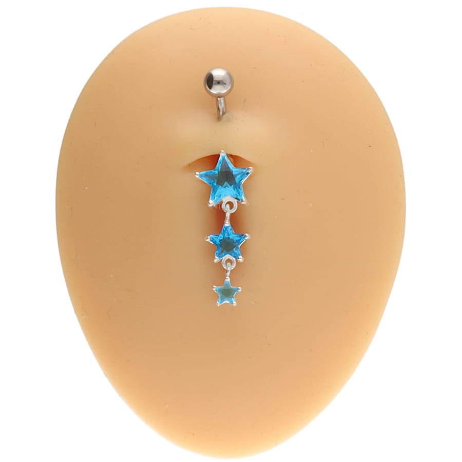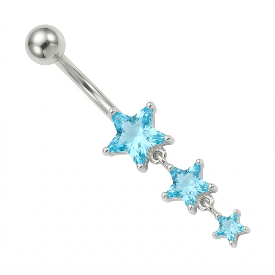 Dekoracyjny wygięty kolczyk do pępka, banan ze stali chirurgicznej w naturalnym srebrnym kolorze. Do banana dowieszona jest ozdoba ze Srebra próby 925 i zakuwanych cyrkonii. Ozdoba składa się z trzech elementów w kształcie gwiazdek różnej wielkości. Pierwszy jest zlutowany sztywno ze sztangą, pozostałe, połączone za pomocą ogniw, są ruchome.