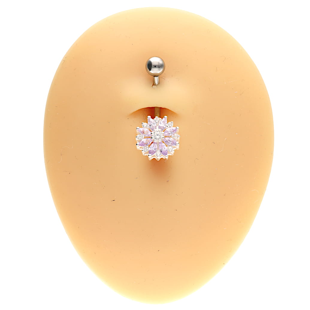 Dekoracyjny wygięty kolczyk do pępka, banan ze stali chirurgicznej w naturalnym srebrnym kolorze. Do banana dowieszona jest ozdoba ze Srebra próby 925 i zakuwanych cyrkonii.