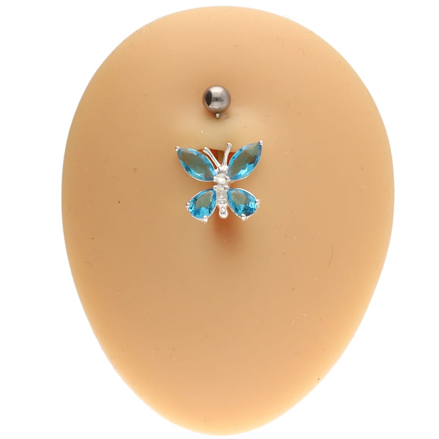 Dekoracyjny wygięty kolczyk do pępka, banan ze stali chirurgicznej w naturalnym srebrnym kolorze. Do banana dowieszona jest ozdoba ze Srebra próby 925 i zakuwanych cyrkonii. Ozdoba w formie motylka jest zlutowana sztywno ze sztangą.