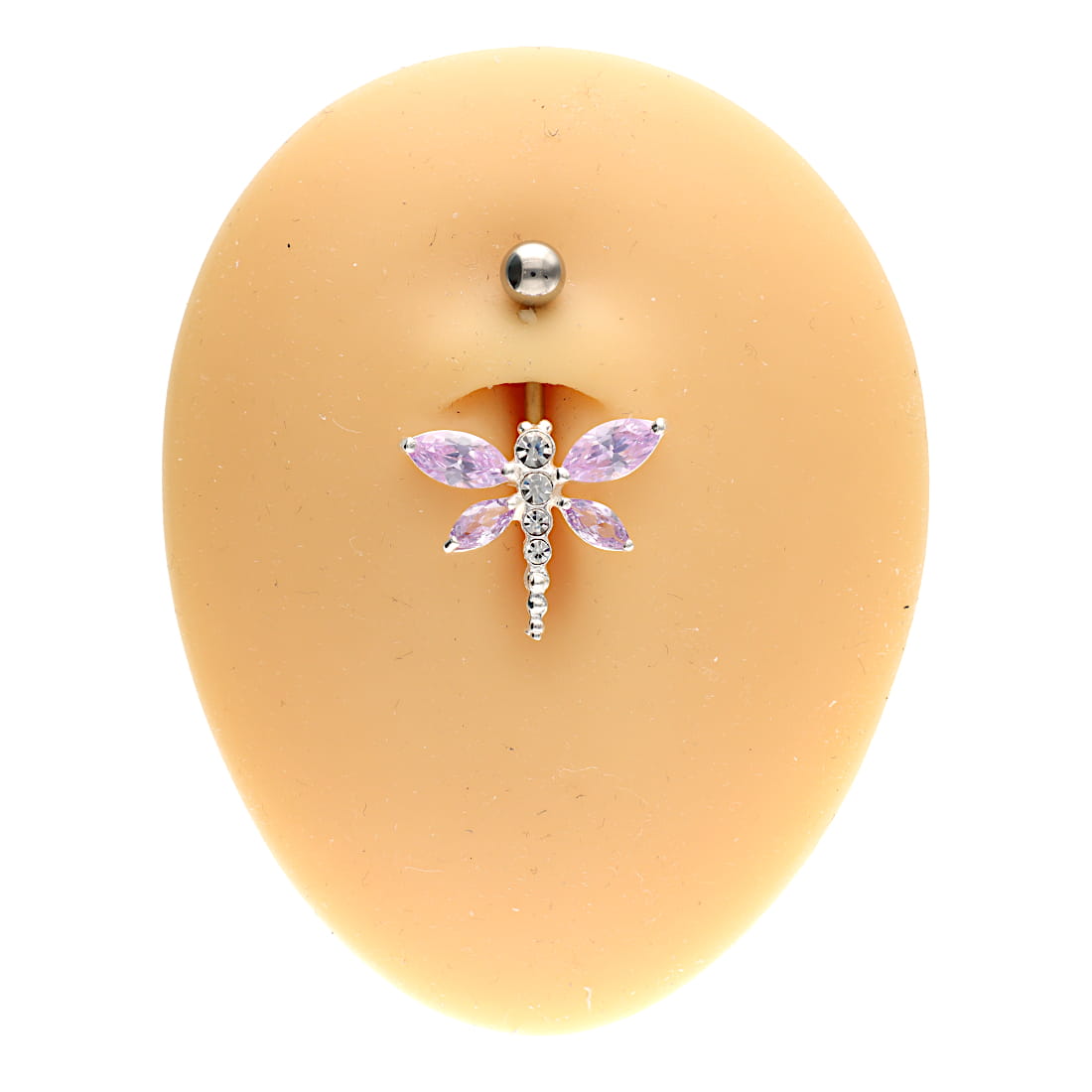 Dekoracyjny wygięty kolczyk do pępka, banan ze stali chirurgicznej w naturalnym srebrnym kolorze. Do banana dowieszona jest ozdoba ze Srebra próby 925 i zakuwanych cyrkonii. Ozdoba w formie ważki jest zlutowana sztywno ze sztangą.