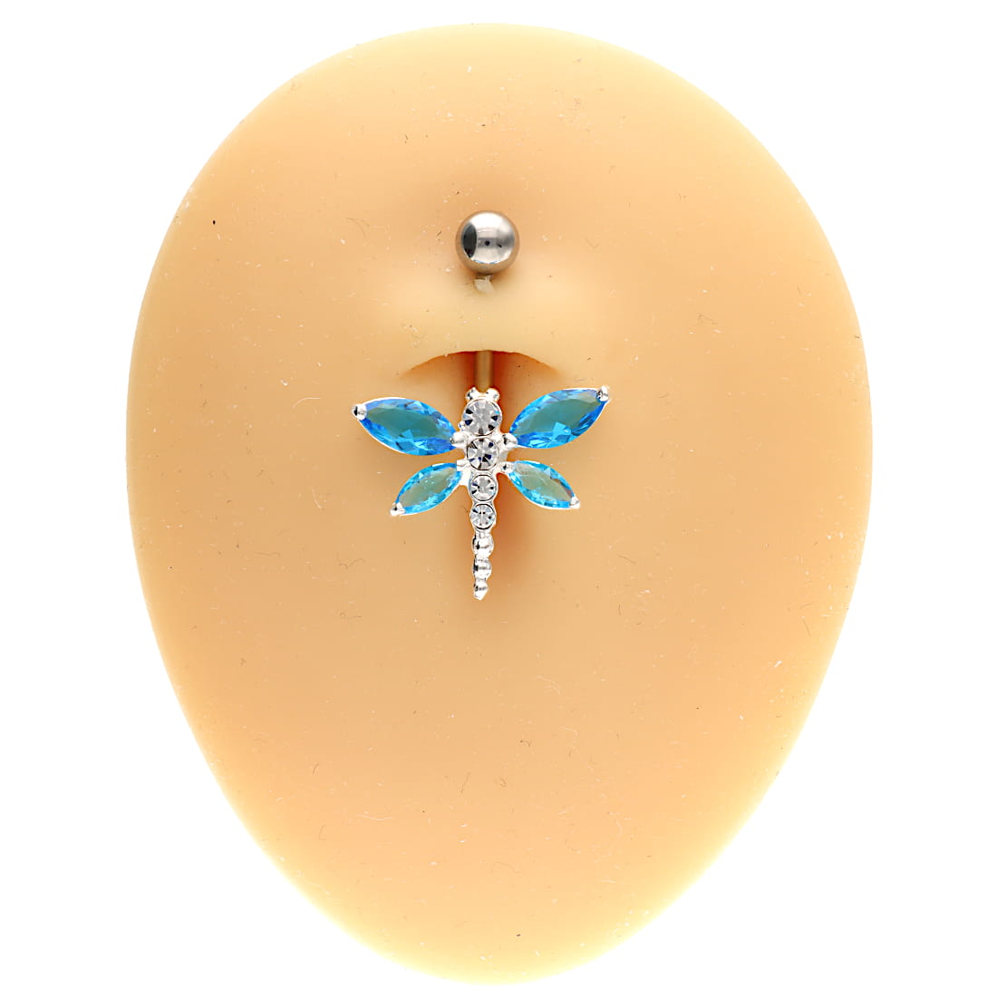 Dekoracyjny wygięty kolczyk do pępka, banan ze stali chirurgicznej w naturalnym srebrnym kolorze. Do banana dowieszona jest ozdoba ze Srebra próby 925 i zakuwanych cyrkonii. Ozdoba w formie ważki jest zlutowana sztywno ze sztangą.