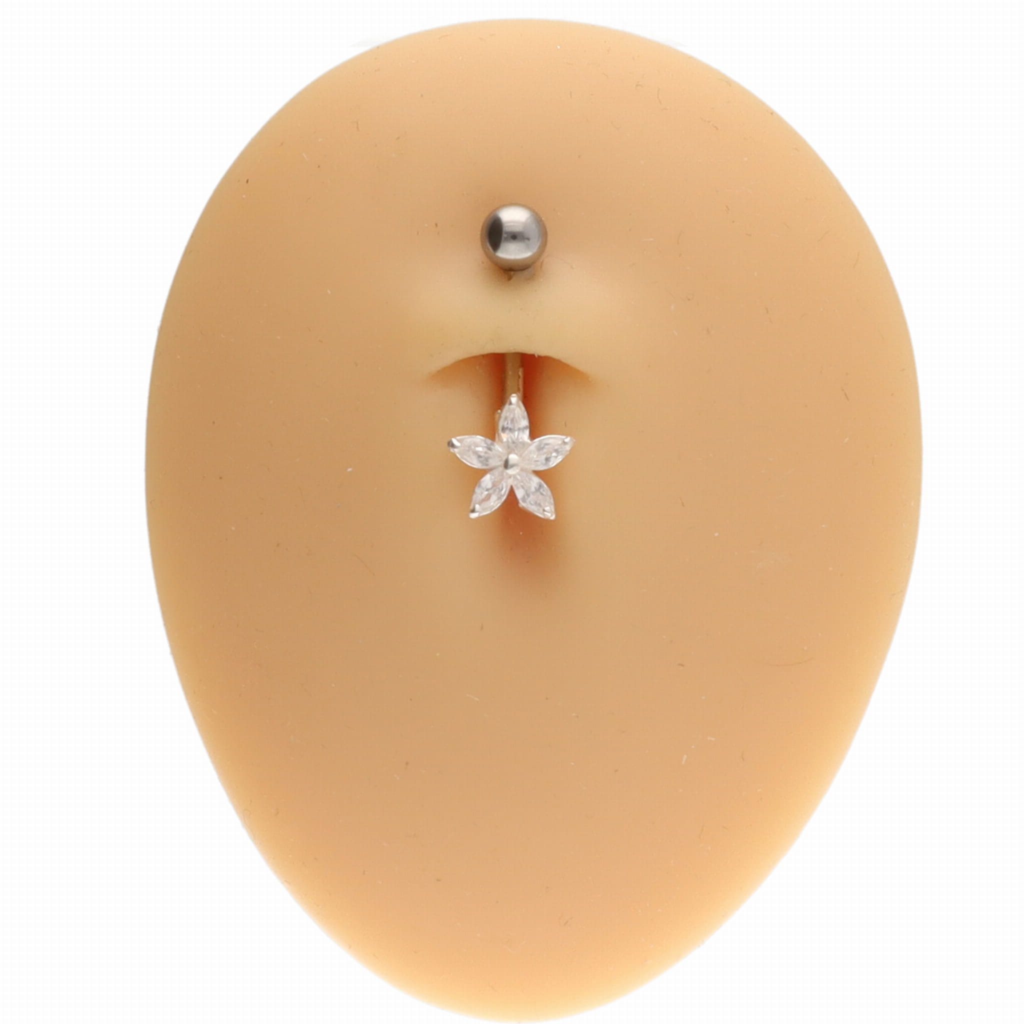 Dekoracyjny wygięty kolczyk do pępka, banan ze stali chirurgicznej w naturalnym srebrnym kolorze. Do banana dowieszona jest ozdoba ze Srebra próby 925 i zakuwanych cyrkonii. Ozdoba w formie delikatnego kwiatka jest zlutowana ze sztangą.