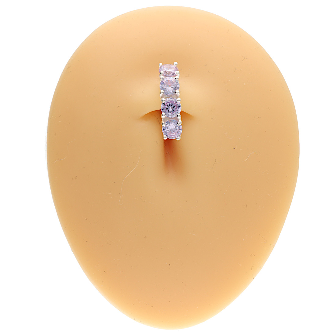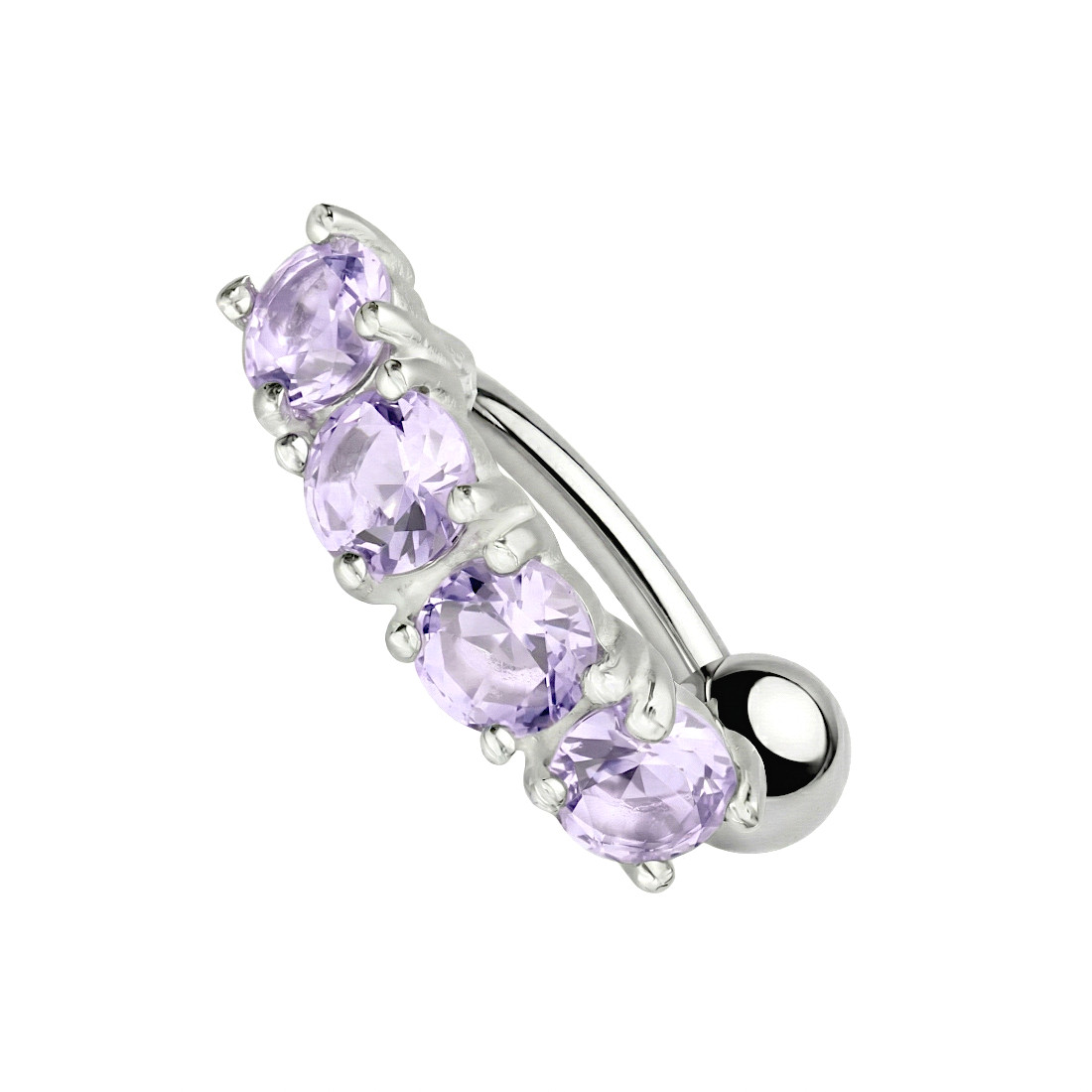 Dekoracyjny wygięty kolczyk do pępka, banan ze stali chirurgicznej w naturalnym srebrnym kolorze. Do banana dowieszona jest ozdoba ze Srebra próby 925 i zakuwanych cyrkonii. Ozdoba w formie rzędu okrągłych cyrkonii jest zlutowana sztywno ze sztangą.