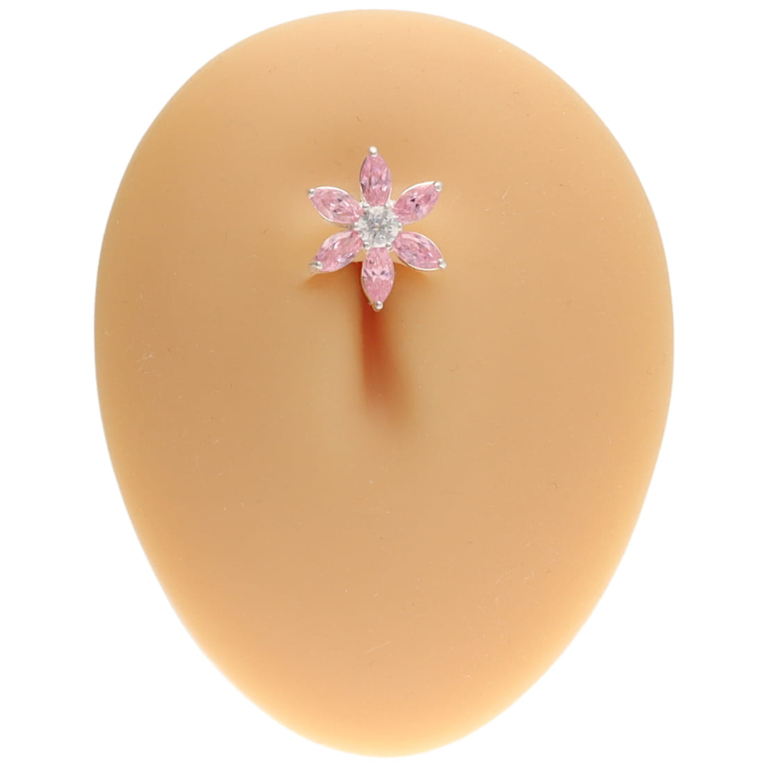 Dekoracyjny wygięty kolczyk do pępka, banan ze stali chirurgicznej w naturalnym srebrnym kolorze. Do banana dowieszona jest ozdoba ze Srebra próby 925 i zakuwanych cyrkonii. Ozdoba w kształcie kwiatka jest zlutowana ze sztangą. Kolczyk wkłada się od góry przekłucia, co sprawia, że kulka jest niewidoczna.