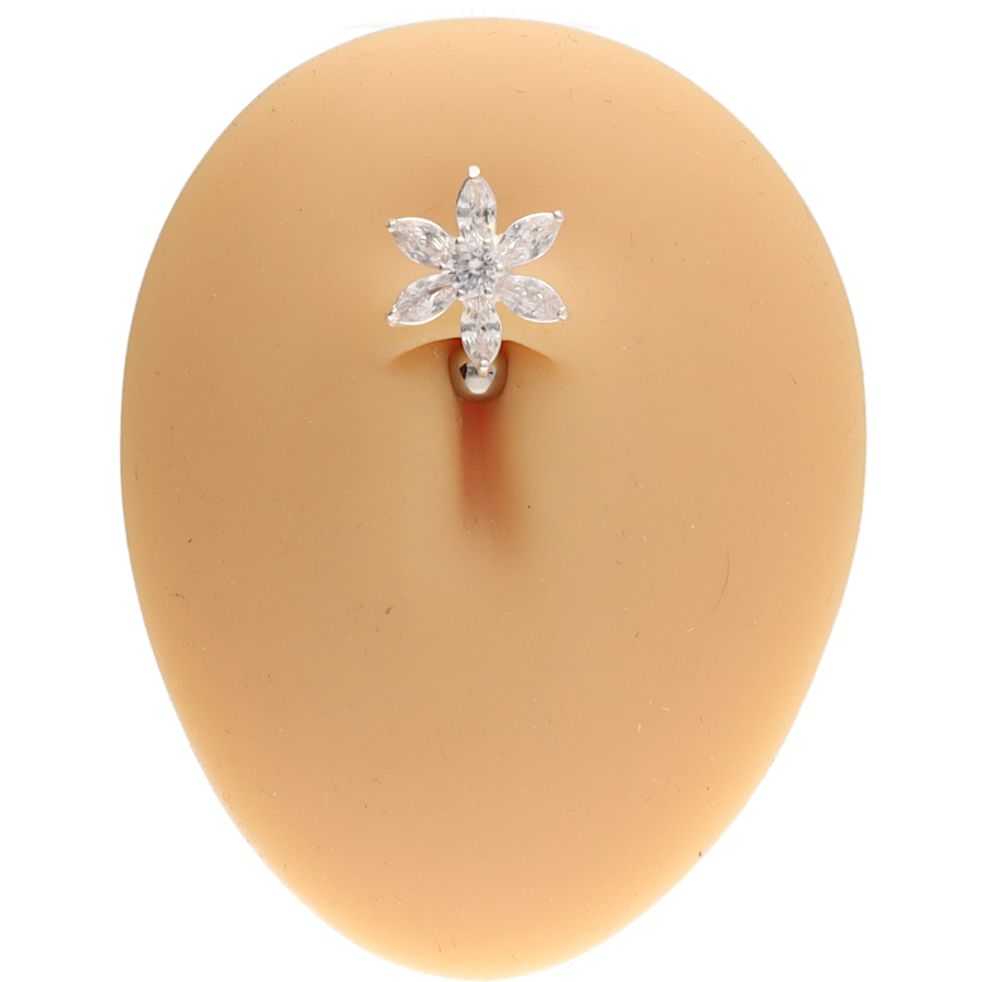 Dekoracyjny wygięty kolczyk do pępka, banan ze stali chirurgicznej w naturalnym srebrnym kolorze. Do banana dowieszona jest ozdoba ze Srebra próby 925 i zakuwanych cyrkonii. Ozdoba w kształcie kwiatka jest zlutowana ze sztangą. Kolczyk wkłada się od góry przekłucia, co sprawia, że kulka jest niewidoczna.